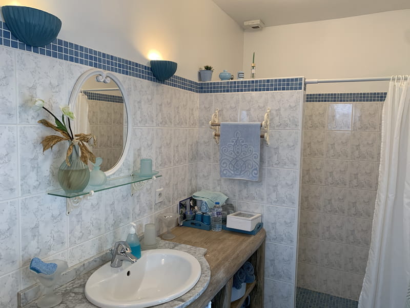 BLEU AZUR chambre de plein pied, lit en 140 + lit en 90, salle d'eau avec douche italienne, lavabo wc, connexion internet dans la chambre, accès au jardin salon de jardin privatif, parking possible dans la propriété