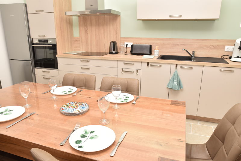 Gîte de plein pied, avec une pièce de vie lumineuse, une table pour 6 personnes (rallonge à disposition), une cuisine entièrement équipée, et un côté salon avec canapé et fauteuils.3 chambres, la grande chambre, avec 1 salle de bain privative, et 2 chambres équivalentes, qui comprennent un grand lit ou 2 lits indépendants. Une salle d'eau avec douche à l'italienne et wc est accessible depuis le couloir entre ces deux chambres. Un wc séparé est accessible depuis le séjour, ainsi qu'une pièce technique comprenant le lave-linge et le sèche-linge, un étendoir, une planche et un fer à repasser.