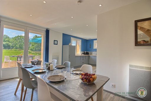 Le gite comprend au rez de chaussée une grande pièce à vivre salon, salle, cuisine entièrement aménagée lave vaisselle, lave linge, cafetière et cafetière à dosettes, bouilloire, grille pain, salle de bains avec wc, douche et petite baignoire. A l'étage : une chambre avec un lit de 160, une chambre avec deux lits de 90, une mezzanine avec banquette, Wc. Draps et linge de toilette fournis, ainsi que lit et chaise bébé à la demande. Nous sommes à votre disposition pour d'autres informations complémentaires