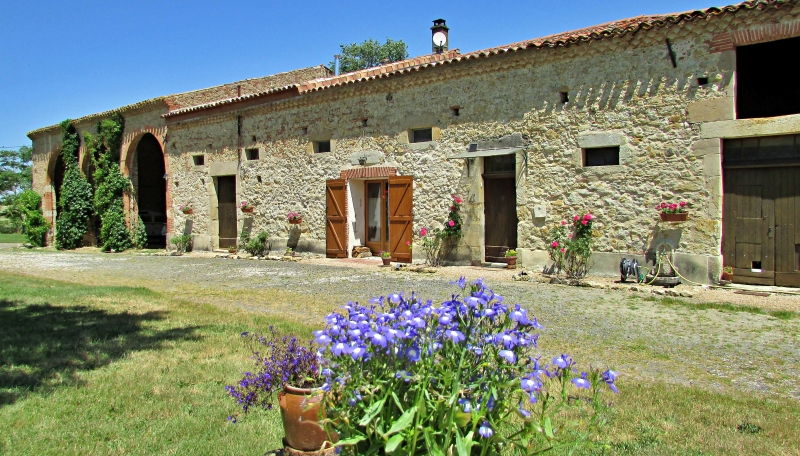 Niché au cœur de paysages idylliques parsemés de champs de tournesol et de blé doré, cette propriété de caractère s’étend sur un hectare d’espaces verts ombragés.
