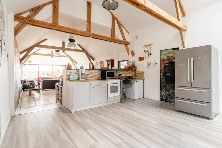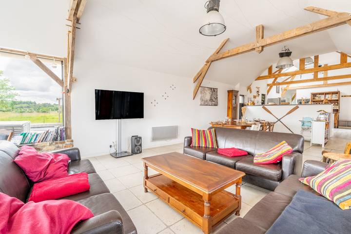 Sur une propriété de 17 hectares avec étang, procurez-vous une vraie déconnexion avec le travail le temps d'un déplacement. Notre gîte de 130m² est composé d'une grande pièce de vie de 60m² vous offrant une vue panoramique sur le domaine et la vallée, d'une cuisine, de 3 chambres, un wc et une salle d'eau avec wc. Il est accessible aux Personnes à Mobilités Réduites. Une grande terrasse où vous pourrez pratiquer le basket, Le ping-pong, le molky... et un terrain de pétanque sont à votre entière disposition.