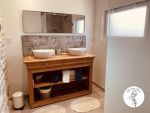 -une salle de bain avec meuble double vasques, douche à l’italienne, sèche-cheveux.