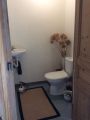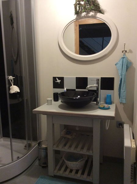 Au rez-de-chaussée, l'entrée comprend un WC avec lave-main, une salle de douche. ainsi qu'un coin repas petit déjeuner avec bouilloir, machine à café Dolce Gusto, grille pain ainsi q'un four micro onde et petit réfrigérateur.