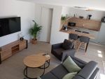 Séjour (canapé, TV grand écran), cuisine équipée.