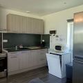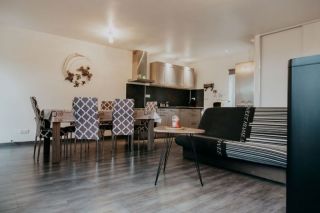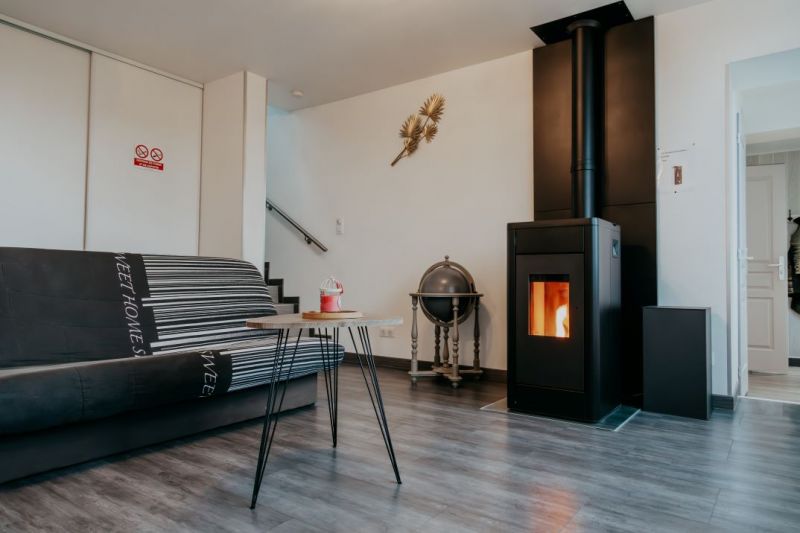 Une cuisine entiérement équipée ouverte sur un coin repas, salon avec poêle à granulés pour se relaxer aprés une journée de travail intense.