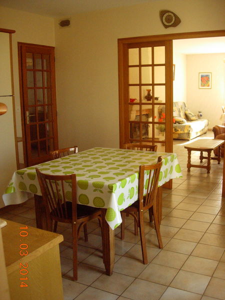 Terrasse exposée plein sud avec salon de jardin et store. Arrière cuisine avec évier, cuisinière avec four électrique, lave linge et congélateur. Cuisine intégrée équipée d’un lave vaisselle, 4 plaques vitro, micro onde, grille pain, cafetière électrique, bouilloire, vaisselle et ustensiles de cuisine, plus téléviseur Salon /Salle à manger avec un clic-clac (Possibilité couchage de 2 personnes). Téléviseur, Chambre 1 avec lit de 140, armoire penderie. Chambre 2 avec 2 lits de 90. Salle de bain avec douche et WC indépendant. Oreillers et couvertures fournis. Possibilité d'avoir lit-parapluie, chaise haute en bois et petit lit en bois pour enfant jusqu’à 3 ans. Tous commerces à 4km. Pas de connexion internet disponible.