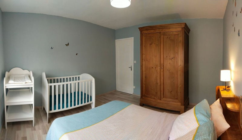 Les chambres : chambre rdc (140/190 + sa salle d'eau), chambre rose (2 lits 90/190), chambre verte (1 lit 180/90 ou 2 lits 90/190), chambre bleue (1 lit 140/190 +1lit bébé)