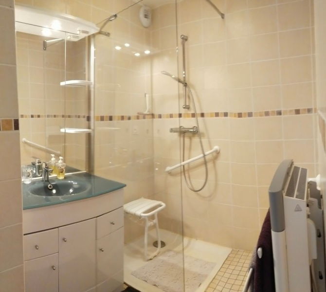 Salle de bain et WC : 1 wc séparé au RDC, 1 salle d'eau intégrée à la chambre du RDC, 1 salle de bain (doubles vasques, baignoire, bidet et wc) à l'étage.