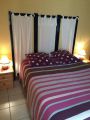 Chambre : lit 140/200, chevets avec lampes, couette, couverture, oreillers, armoire, porte donnant accès à la terrasse. Accès internet gratuit.