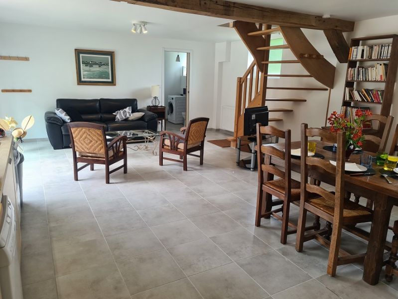 Il comprend : au rez de Chaussée une vaste pièce avec une salle à manger-cuisine, et un salon ouvert sur le salon de jardin avec Barbecue. 1 wc indépendant. A l'étage : un grand palier, 1 chambre (3 lits 0,90 m), 1 chambre (1 lit 1,60 m), salle d'eau avec wc. Le stationnement sécurisé dans la cour permet aussi le rechargement d'un véhicule électrique avec une prise renforcée green up. Un barbecue est à disposition. des séjours de quelques jours à plusieurs semaines sont possibles.