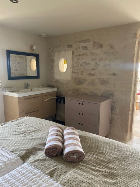 Vous adorerez le décor élégant de cet hébergement de charme. Suite pour 2 personnes Une jolie cuisine toute équipée, une chambre avec son grand lit de 160 cm (2 lits rapprochés), une salle de douche moderne et une déco choisie avec grand soin Grande cour pour garer votre véhicule en toute sécurité Repas du soir sur demande en semaine uniquement.
