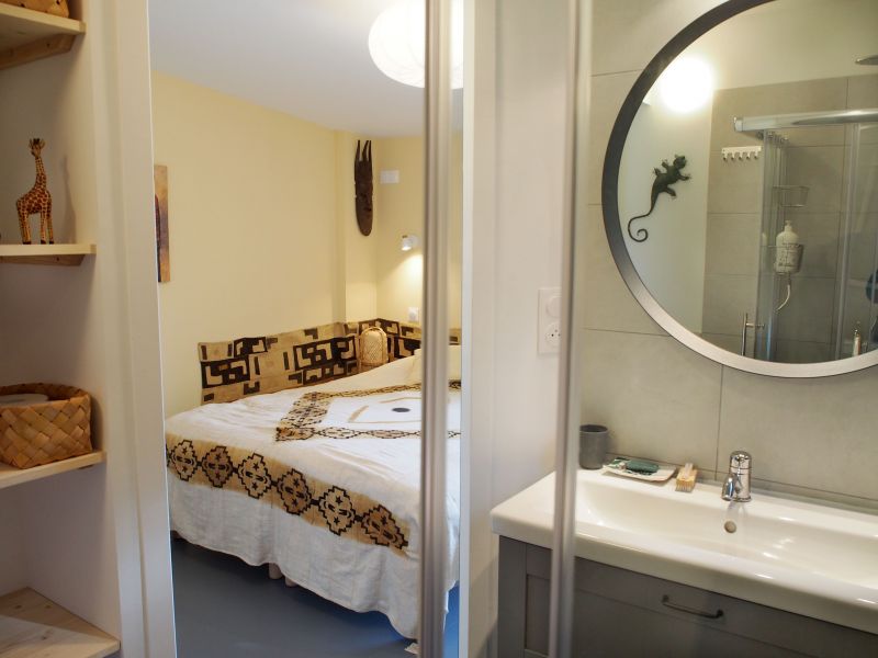 Elle a un lit double de 160/200 qui peut être dédoublé et donne sur la salle de bain équipée d'une douche à l'italienne et des toilettes. La fenêtre ouvre au sud et l'entrée se fait par une baie vitrée côté est. Une porte communique avec la cuisine- salle à manger- salon : fenêtre côté nord et accès à la terrasse par une baie vitrée côté est, plein soleil le matin et ombre assurée l'après-midi.