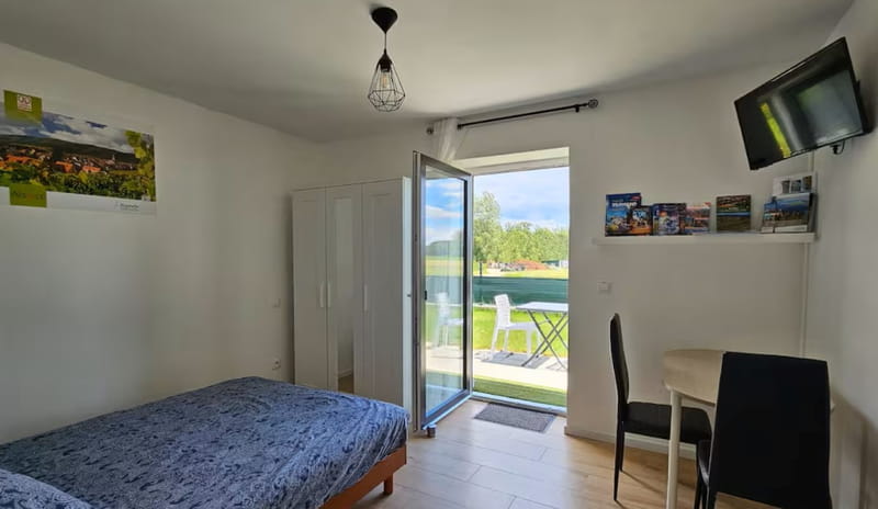 Séjournez dans un studio neuf au calme, avec vue sur la nature, classé meublé de tourisme 2 **. Le village d'Osthouse est situé en Centre Alsace près d'Erstein sur l'axe routier entre Strasbourg, Selestat, Colmar et à proximité de l'Allemagne et de son célèbre parc d'attraction Europa Park et Rulantica. Le logement accessible de plain-pied avec entrée indépendante, kitchenette, salle de bain et terrasse indépendante avec vue sur la nature et parking privatif. Linge de lit et de maison ainsi que serviettes sont inclus. La pièce de vie possède un lit pour 2 personnes, une armoire, une table et une télévision.