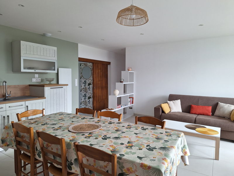 - une pièce de vie avec cuisine toute équipée, coin salon et grand écran, espace repas.