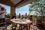 Le gîte fait partie d'un ensemble de 5 locations mitoyennes, sans vis à vis. Les volumes du gîtes sont agréables, la lumière est bien présente. Il comprend un séjour cuisine sur 2 niveaux avec quelques marches. Le salon avec cheminée insert (un canapé convertible) est ouvert sur une belle terrasse. Vous profitez d'un beau panorama. Vous avez une chambre semi fermée au-dessus du salon avec un lit 140, une chambre avec 3 lits une place dont 2 superposés, une salle de bains, un wc.