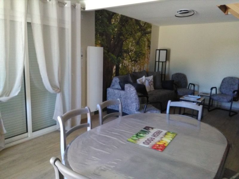 depuis la salle de vie, on accède directement par la baie vitrée sur une grande terrasse (salon de jardin, store-banne, barbecue électrique).
