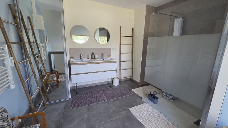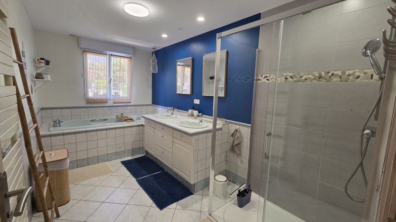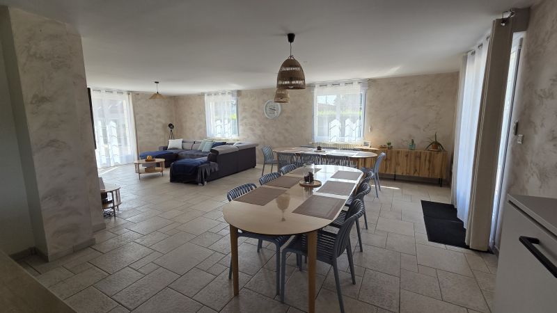 La maison est éloignée du bord de la route. Au rez-de-chaussée : 1 entrée, 1 wc séparé, 1 chambre, 1 salle de bain (avec lavabo double-vasque, douche, baignoire), 1 buanderie, 1 pièce ouverte cuisine - salle à manger - salon, 1 escalier donnant accès au garage et 1 escalier donnant accès à l’étage. A l’étage : 1 mezzanine spacieuse avec coin activités pour enfants, 4 chambres, 1 wc séparé, 1 salle de bains (lavabo double vasque + douche). La maison présente 3 chambres adultes, chacune composée d’un lit double (160 x 200 cm), d’un lit bébé (60 x 120 cm), ainsi que d’un dressing, vous permettant de ranger et d’organiser toutes vos affaires. Les deux dernières chambres présentent chacune 4 lits simples (90 x 200 cm), et un dressing également. Au sous-sol : 1 salle de jeux (babyfoot, billard, panier de basket, table de ping-pong, cible de tir...), 1 local technique pour y entreposer vos vélos, cerf-volant, kitesurf, paddle…