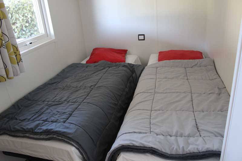 Chaque hébergement comprend deux grandes chambres, dont une avec un lit double (140) et une avec deux lits (90), une salle de bain, un wc séparé, une pièce de vie principale avec de quoi faire votre cuisine et télévision.