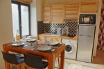 - cuisine américaine, plaque électrique, four, hotte, évier 2 cuves, 1 égouttoir, micro-onde, congélateur-réfrigérateur, séparation bar, 2 tabourets bar, machine à laver linge.