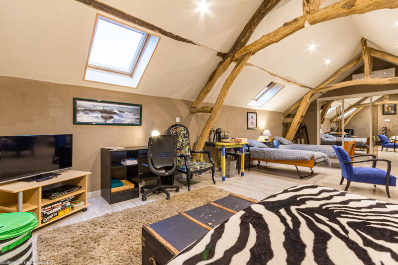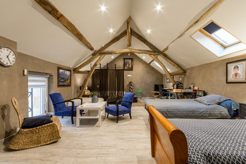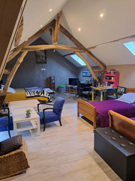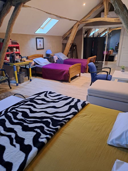 Grande chambre de 38 m², au 1er étage de notre maison avec salle de douches et wc indépendant. Chambre très calme et climatisée au prix de 70 € pour deux personnes, 10 € par personne supplémentaire jusqu'à 5 personnes.