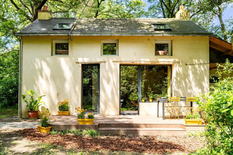 Gîte 4/5 personnes en pleine nature dans une maison indépendante tout confort récemment rénovée, nichée parmi de grands chênes. Calme absolu et pas de vis à vis. Située dans une propriété de charme de 5ha, idéale pour un week-end ou de longs séjours. Proche d’une cité de caractère - La Roche-Bernard - et de magnifiques plages comme Pénestin avec ses falaises dorées. À 5mn de la 4 voies Nantes-Vannes. Au rez-de-chaussée cuisine équipée (lave-linge, lave-vaisselle, réfrigérateur, congélateur, plaque de cuisson à gaz...), salon avec 2 fauteuils et un clic-clac, cabinet de toilette avec douche, grande terrasse en bois avec table et chaises d’extérieur. Connexion Wifi.