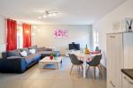 Une petite pièce avec canapé convertible (130X200 pour un couchage supplémentaire), télévision à écran plat avec prise USB, table et chaises pour votre confort.