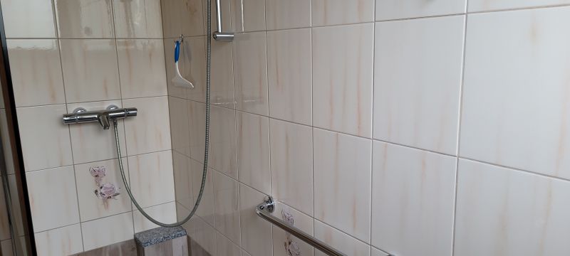Salle de bain avec baignoire-douche, toilettes et machine à laver.