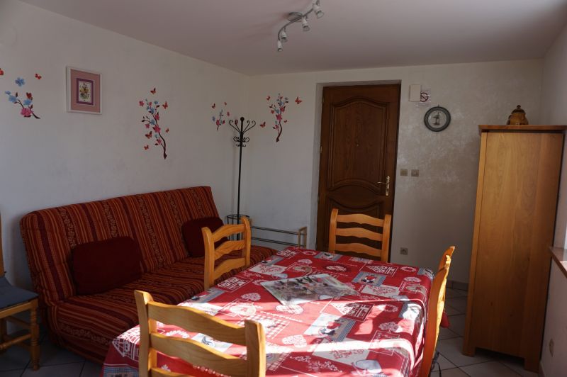 Salon - salle à manger avec canapé clic-clac pour 2 personnes. TV, radio, prospectus.