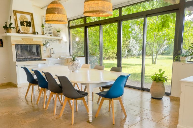 Salle à manger : Véranda avec table et chaises pour 10 personnes, ainsi qu'une chaise haute.