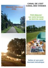 Nous louons 3 chambres d'hôtes au bord du canal des Vosges (canal de l'Est) et de la Voie Bleue (V50), labéllisés hébergements accueil vélo et hébergements pêche. Nous avons une grande terrasse ombragée avec un terrain de pétanque permettant de se délasser et se ressourcer.