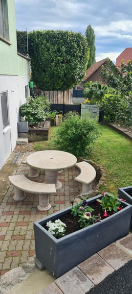 La terrasse est aménagée avec une table et un barbecue. Espace gazon avec 2 transats