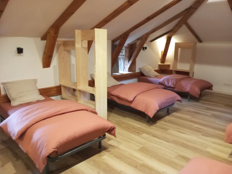 Sur 230m2, 4 niveaux desservis par une escalier dans la tour, 3 chambres doubles et une chambrée de 6 lits simples, Wifi, salle de bains et wc à chaque étage : confort et esthétisme pour passer un moment constructif, hors du temps et des contraintes quotidiennes.