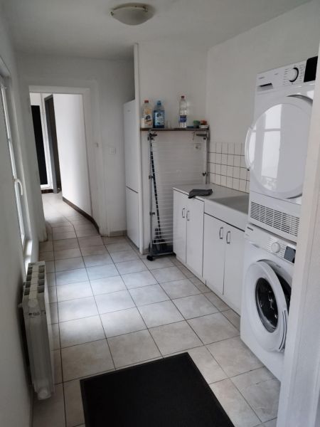 -une buanderie avec lave-linge et sèche-linge, etendoir à linge ainsi qu un fer à repasser et sa planche.