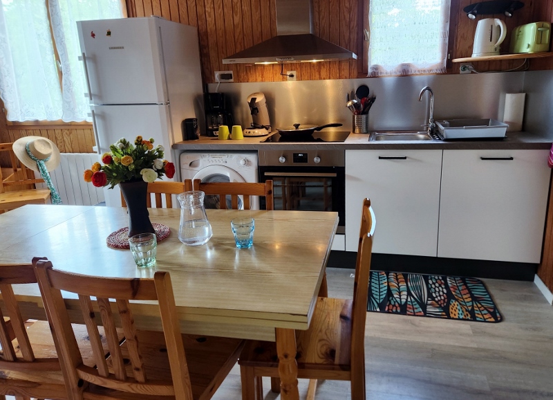 Séjour avec couchage d'appoint, espace cuisine avec plaque à induction, four, lave vaisselle, combiné lave linge/sèche linge, micro onde, cafetière, senseo et électroménager complet.
