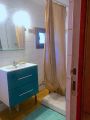 Dans la salle de bain se trouvent une douche, une lavabo et les toilettes
