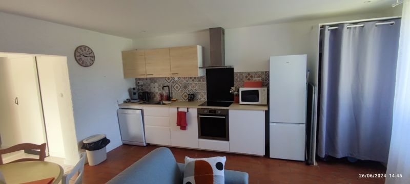 -Une pièce à vivre d'environ 20m² carrelée de tommettes, avec une fenêtre donnant sur le jardin, dispose d'une cuisine totalement équipée avec plaque de cuisson à induction, lave-vaisselle, four traditionnel et micro-onde, d'un frigo congélateur, d'une machine à café Senseo à dosettes, d'un grille-pain, d'une bouilloire ainsi que de nombreux ustensiles.