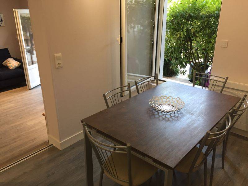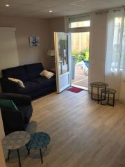 Appartement d’une surface de 50 m² en rez de jardin avec jardin. A l’extérieur, une terrasse avec table chaise (4) et chaise longue (2). Il se compose de deux chambres l’une avec 1 lit queen size et un grand dressing et 1 autre chambre avec des lits jumeaux avec penderie. Un salon avec canapé et un fauteuil et 4 petites tables basses, un meuble télé avec lecteur DVD, mini-chaîne stéréo et télé avec écran plat. Une cuisine séparée avec table et cuisine, équipée de plaque vitro hotte, micro onde, four électrique, machine à laver la vaisselle, machine à laver-séche linge, frigidaire, cafetière, bouilloire, grille pain et toute la vaisselle et ustensils de cuisine. La salle de bain est équipée d'une douche à l'italienne et les toilettes sont séparées. Les lits sont faits avec des draps en percale de coton, des serviettes de toilette sont mises à disposition 2 par personne (un drap de bain et une plus petite). Pour un meilleur confort, vous trouverez : torchons, essui tout, serviette de table papier, papier toilette et sac poubelle. Tous les produits d'entretien à disposition, ainsi que produits écologique douche et cheveux. Dans la salle de bain, il y a kit de couture, charlotte douche, kit vanity, sèche cheveux. Pour votre acceuil dans votre chambre vous trouverez une pair de chaussons avec les serviettes de toilettes.